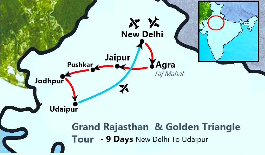It is a 9-day India tour covering Delhi, Agra, Jaipur, Pushkar, Jodhpur and Udaipur, combining the iconic Golden Triangle with Rajasthan’s royal heritage cities.