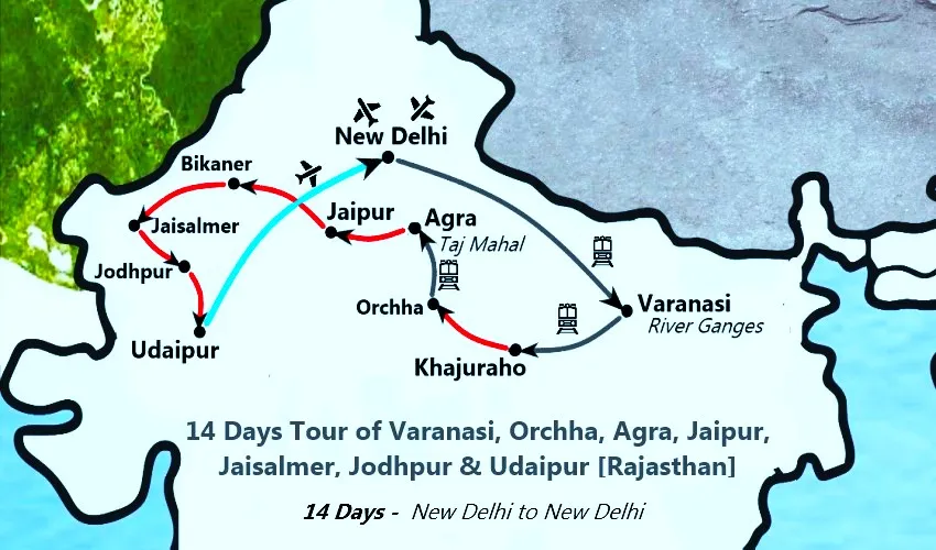 The itinerary covers Delhi, Varanasi, Khajuraho, Orchha, Agra, Jaipur, Bikaner, Jaisalmer, Jodhpur, and Udaipur.