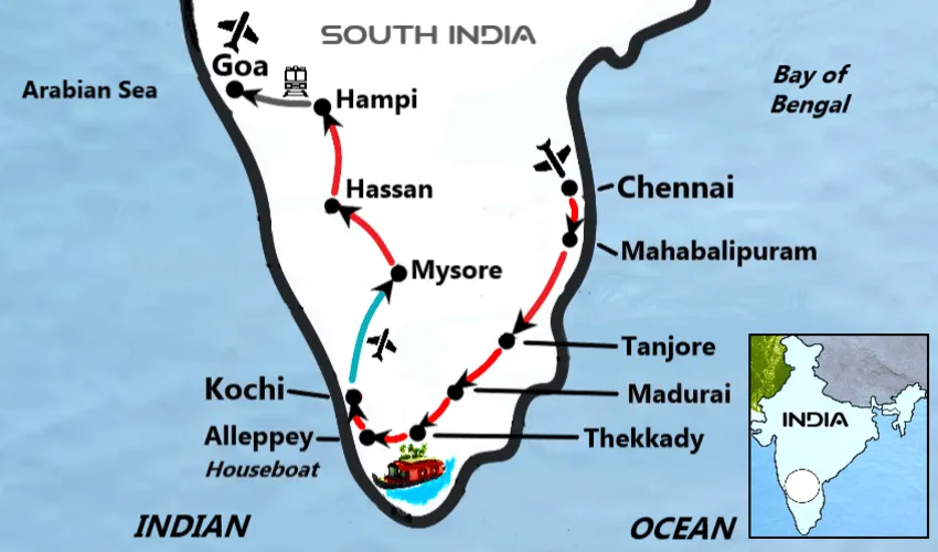 Prepare for an unforgettable 18-day journey that expertly blends ancient history, breathtaking nature, and lively coastal fun across South India! Explore the magnificent temples of Tanjore and Madurai, then jump into the lush spice plantations of Thekkady and the tranquil Kerala Backwaters. Discover royal grandeur in Mysore followed by intricately carved temples of Belur and Halebid. Witness amazing ancient ruins of Hampi, a UNESCO World Heritage site, before relaxing on the sun-drenched beaches of Goa. This all-inclusive tour is your gateway to experience the incredible diversity and rich culture of this captivating region!